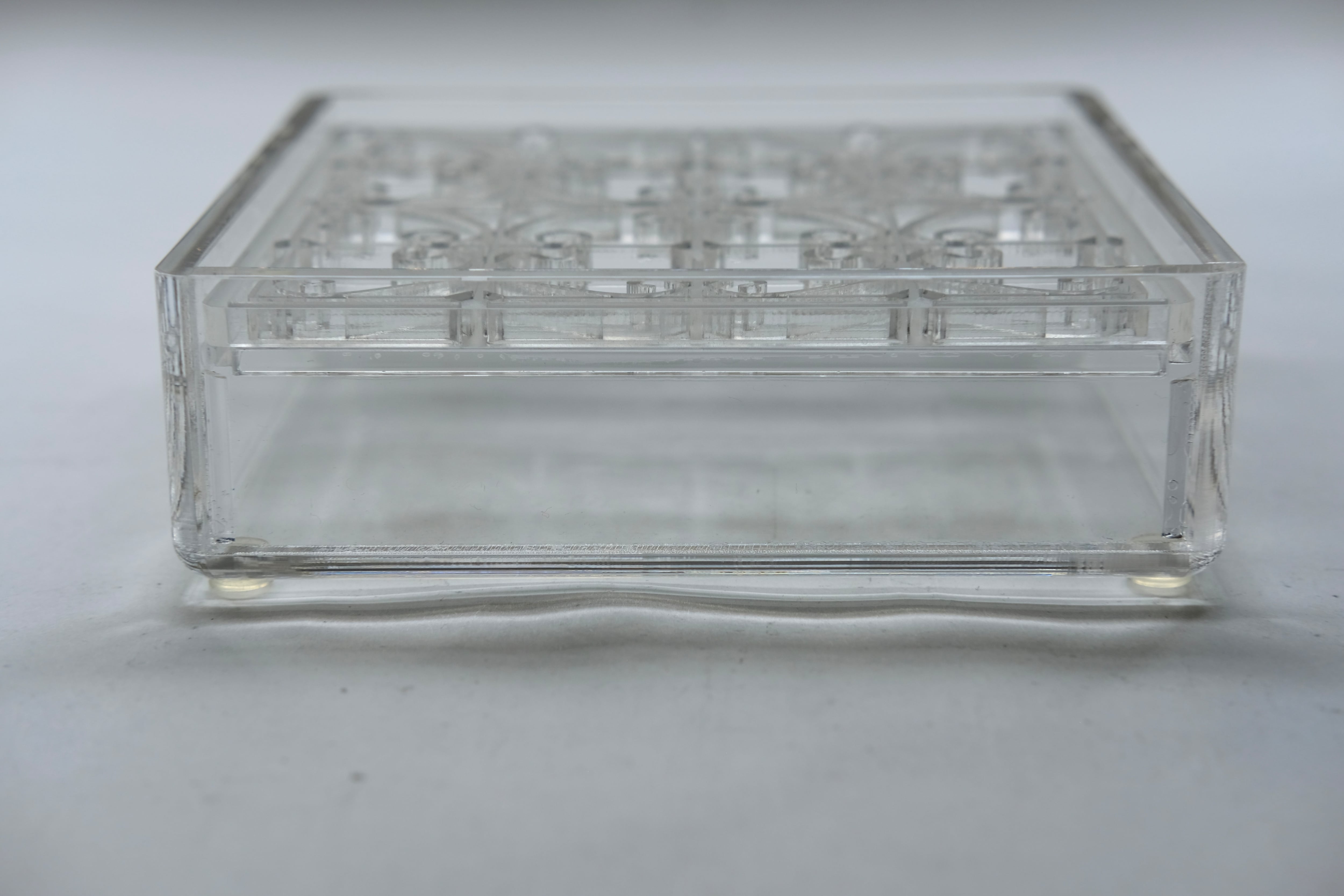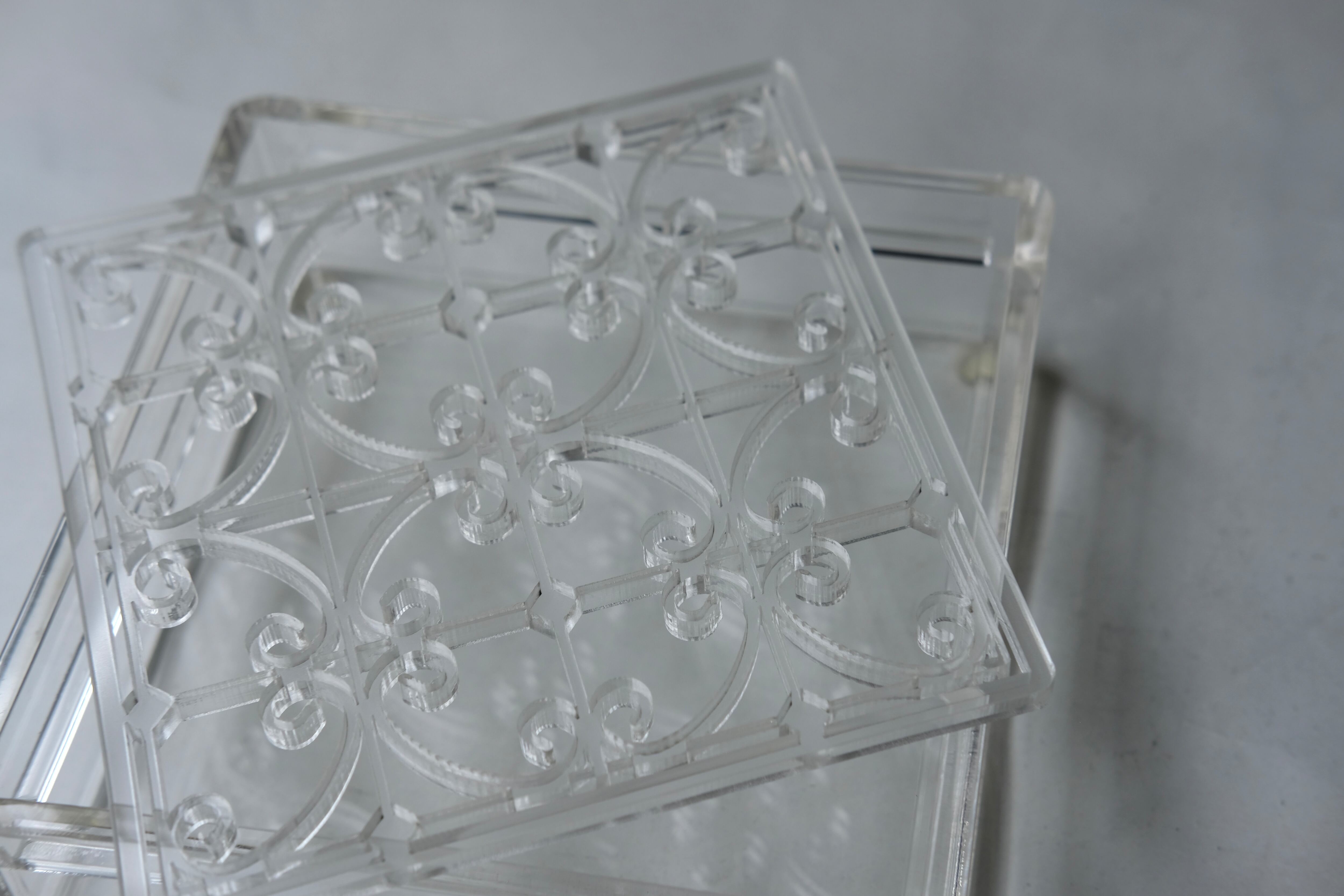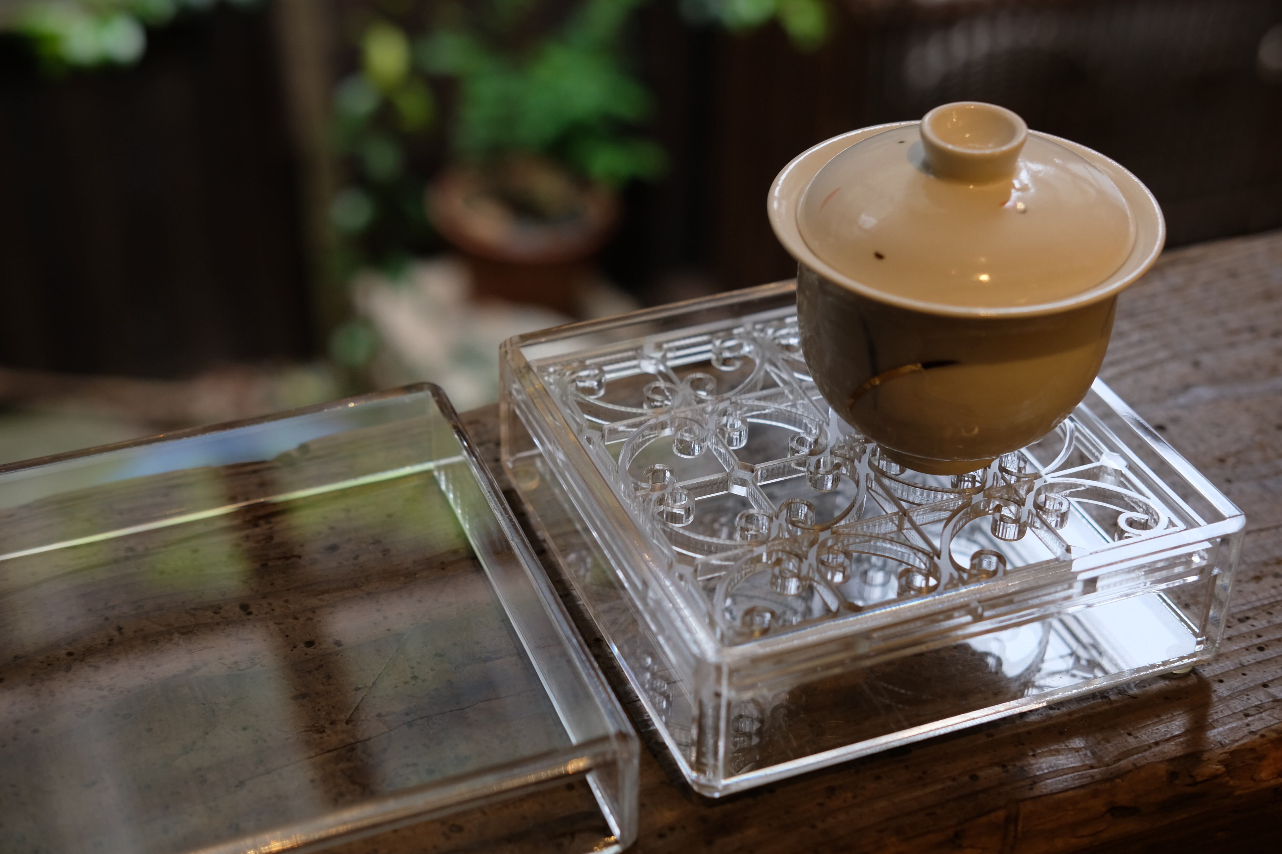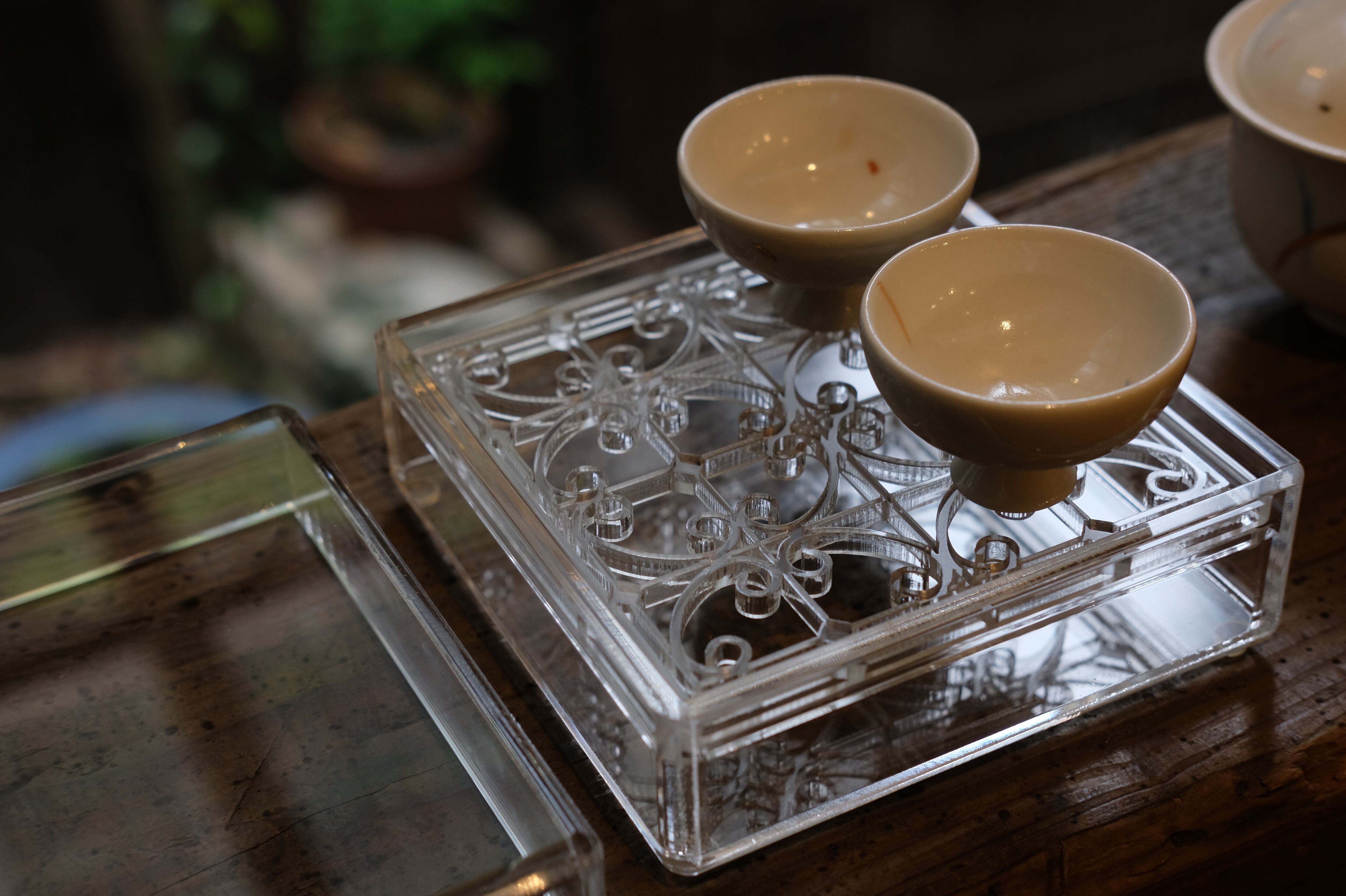 台湾の鐵窓花の模様が立体的に施されたアクリル製の茶承。