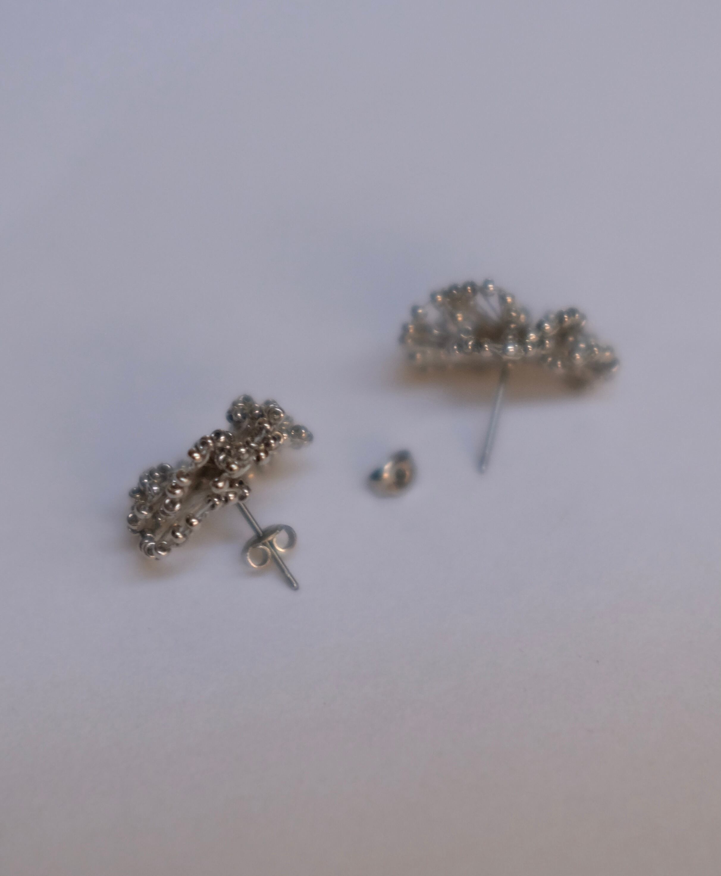 変色しにくい上質なシルバービーズと、蚕糸(シルク糸)ならではの美しい光沢が織りなす上品な佇まい。